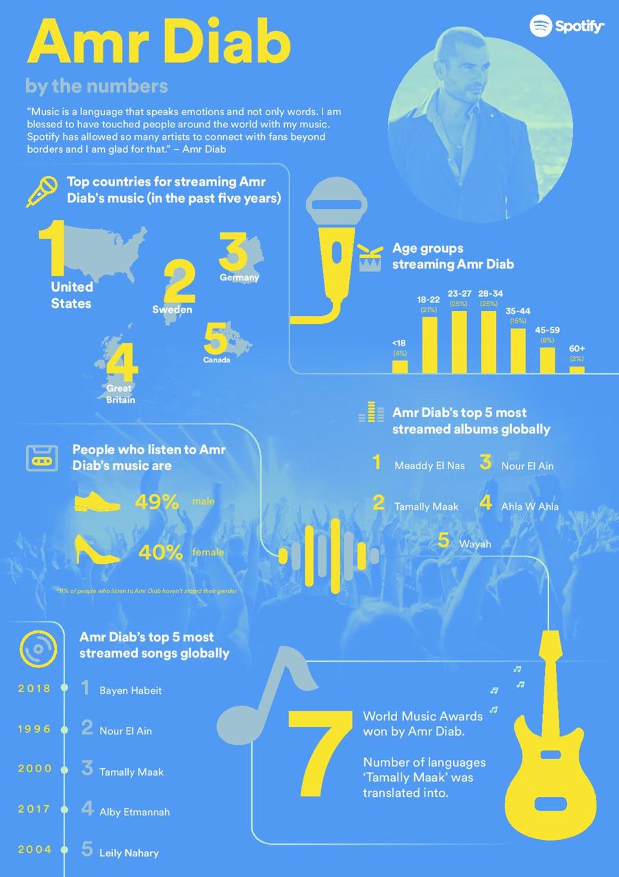 In addition to the campaign, Spotify delivered info-graph about the top countries for streaming Amr Diab’s music during the last 5 years, Amr Diab’s top 5 most streamed songs globally, Age groups streaming Amr Diab and more facts (in Arabic and English)